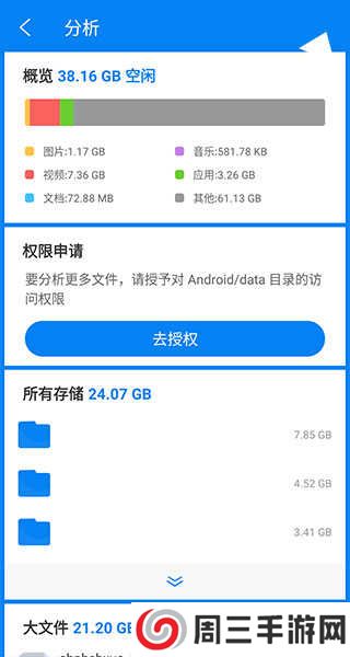 3、之后会弹出窗口,我们点击分析解开查看当前占用手机存储空间最大的文件夹以及所有大文件,方便用户对无用的大文件进行管理删除操作(建议删除前点击查看是否为需要的文件)
