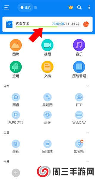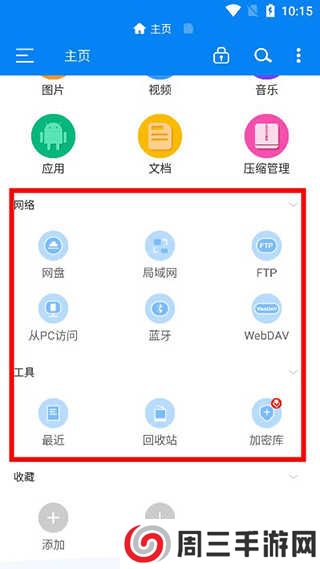 4、在软件的侧边栏当中,我们能够非常清晰的看到存储、网络、收藏等功能;
