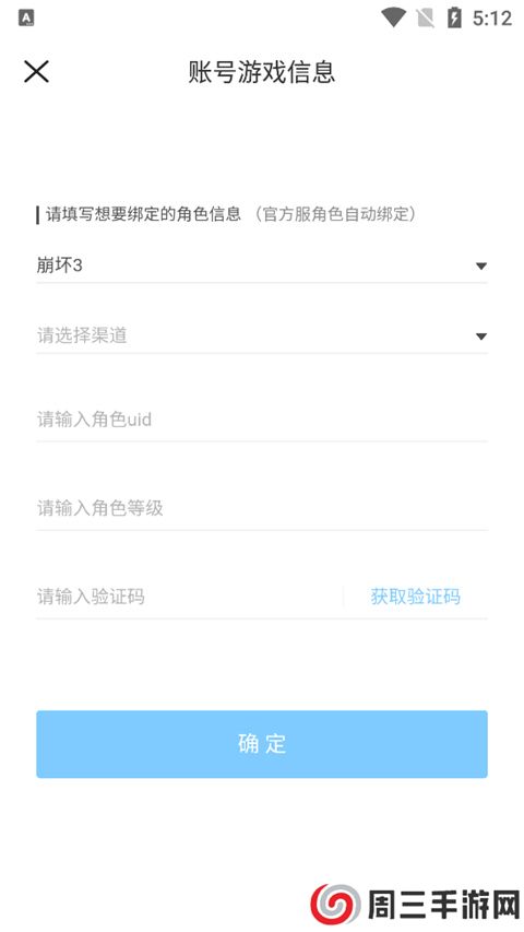 4、输入想要绑定角色的信息,如游戏、渠道、uid、等级、和验证码,点击确定即可。