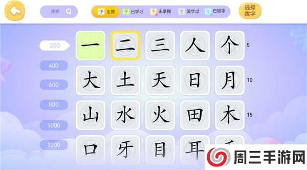1、打开软件,可以看到里面有许多的汉字可以学习,遵循着由简到繁的原则,先从中文数字开始学习,后面再是复杂的汉字学习