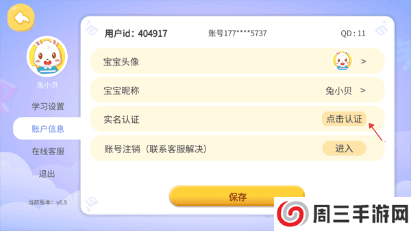 3、默认为学习设置界面,往下点击账户信息,选择右边实名认证的“点击认证”。