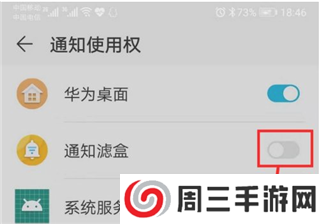 2、然后就会跳转到手机设置中的“通知使用权”页面,点击“通知滤盒”后面的开关,在弹出的提示框中点击【允许】。