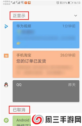 3、允许通知权限,进入应用后,在“通知历史”页面中,可以看到“正显示”和“已取消”的消息。“正显示”列表中的消息就是手机下拉通知栏上显示的消息,当我们点掉下拉通知栏上的消息后,该消息就会归到“已取消”列表中。