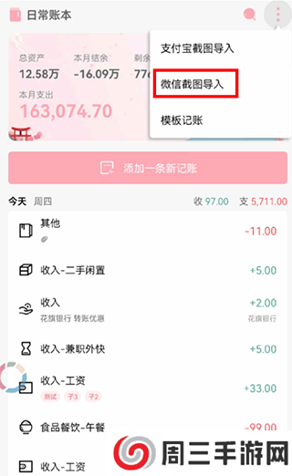 2、进入一木记账app后,点击右上方,选择【微信截图导入】;