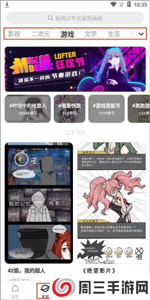 3、发现功能中玩家能够与其他的用户一同参与有关影视、生活、游戏、二次元、文学等用户感兴趣的话题;