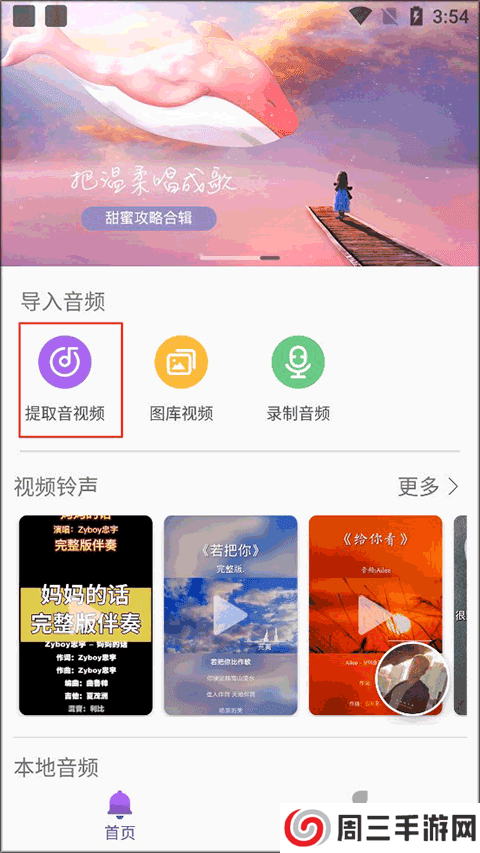 1、首先我们先进入到66铃声的主页,可以看见主页上方就有提取音视频的功能,我们点击它。