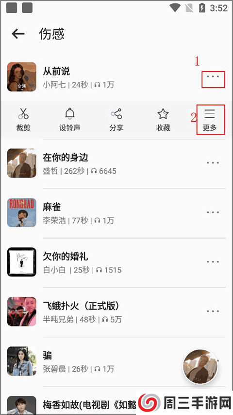 我们先在铃声界面找到我们需要下载的,先点击歌曲后面的3个点,再在弹出的列表中点击更多。