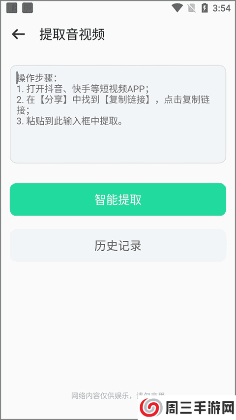 2、点击过后我们需要复制需要提取音频的分享链接然后粘贴在上面的输入框,然后再点击智能提取就可以了。
