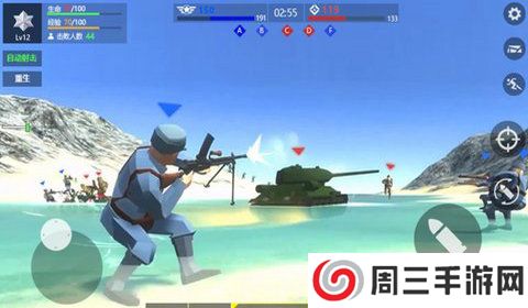 3. 进入战斗:选择完兵种和武器后,玩家将进入战斗场景。通过滑动左下角的摇杆进行移动,点击右下角的射击按钮进行攻击,还可以使用下方的按钮切换武器和道具。