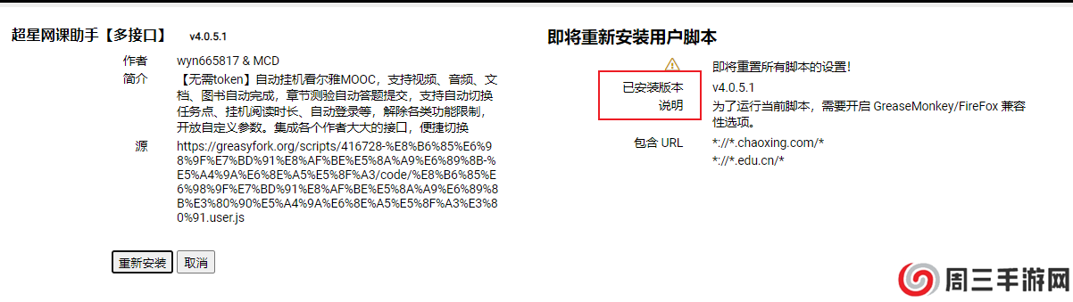 再次点入进去安装此脚本这个按钮,若显示已安装此版本则证明安装成功: