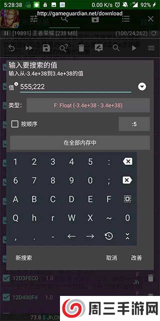 当我们需要搜索两个数据的时候,一个一个搜索起来的话数值会很多,容易奔溃,那么我们就可以用到联合搜索,比如生命值是555,攻击力是222,那么我们就在搜索面板输入555;222,就是一个数值加一个分号然后再加另一个数值,分号在搜索面板有。