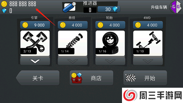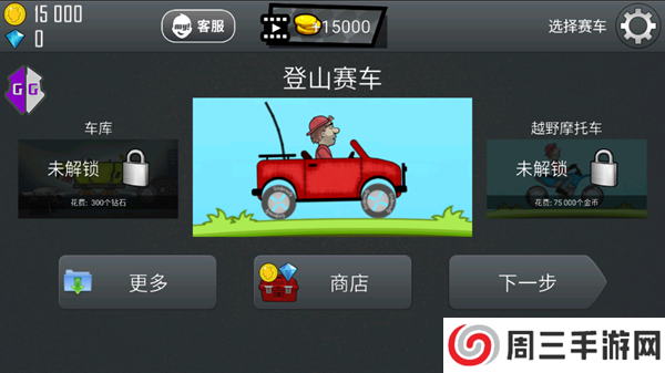 4、进入《登山赛车》后,我们需要通过关卡赚取一些金币,如下图所示,此时金币为15000。