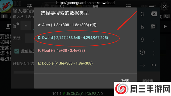 8、选择DWORD数据类型(此类型可加快搜索速度)。