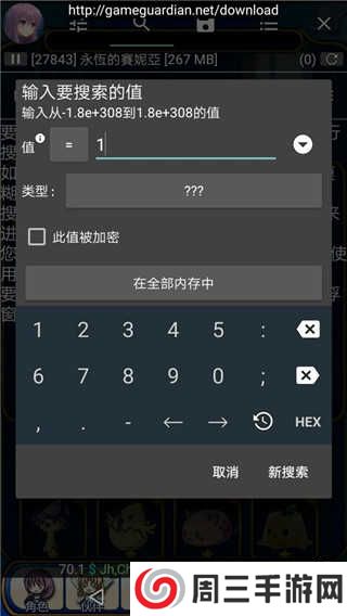 7、输入金币的数量并勾选【此值被加密】,点击【新搜索】。