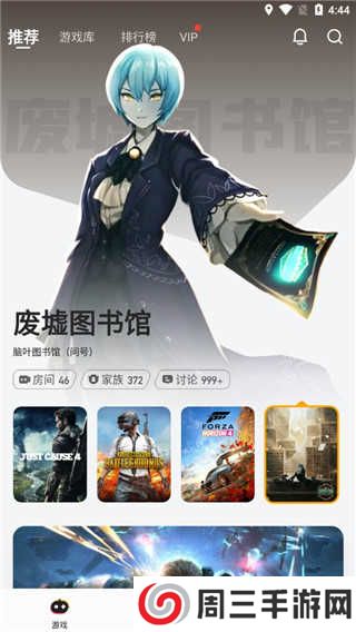 2、游戏页面,推荐热门的游戏或者是新出的游戏,游戏库拥有很多类型的游戏,还可以查看你的游戏榜单、VIP服务等;