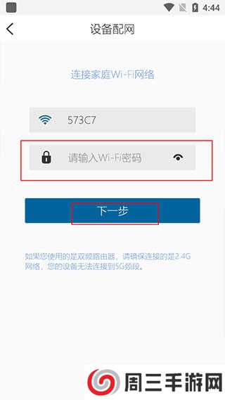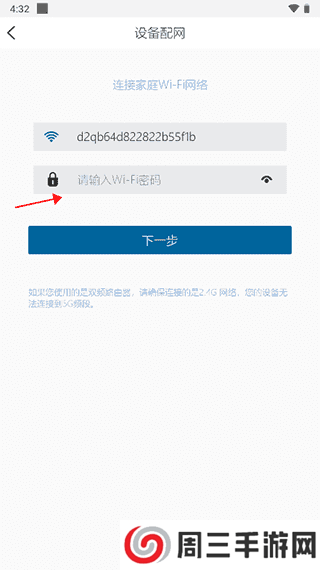 5、输入无线网络密码,选择下一步,不过大家需要注意如果您使用的是双频路由器,请确保连接的是2.4G网络,您的设备无法连接到5G频段。