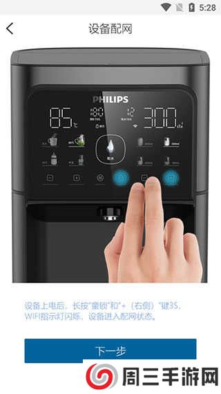 4、设备上电后,长按“童锁”和"+(右侧)”键3S,WIFI指示灯闪烁,设备进入配网状态,点击下一步。
