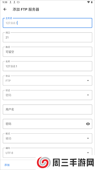 然后设置主机名设为127.0.0.1(关键,指服务器本机,这样传输的时候会直接走本机网络,速度极快)、端口(刚才设的)、路径(指刚才设置的根目录的相对路径,可不填)、名称(随便设一个,显示在列表里的名称,不设就是127.0.0.1)、协议(默认FTP)、验证(默认密码)、密码、模式(默认被动)、编码格式(默认UTF-8)。设置完保存,列表里出现刚才设置的名称。配置完成后启动下就可以使用ftp文件服务功能了