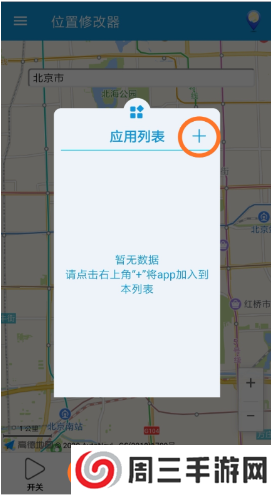 3、点击底部菜单中的"应用”,从应用列表里选择1个app启动。初始状态下应用列表里为空,点击右上角的加号(+)将需要修改位置的app加入到应用列表。添加并返回后,应用列表里就会出现刚刚添加的app。