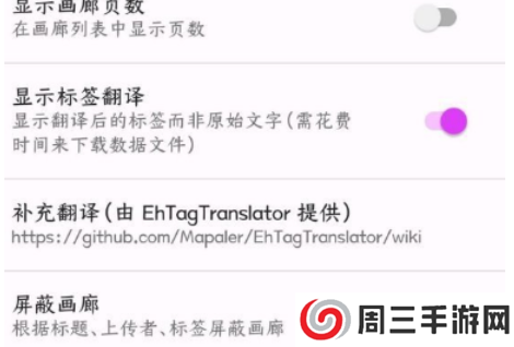 2、如果想要将标签全都设置为中文的话,可以在EHviewer中打开设置,然后点击打开“补充翻译”。