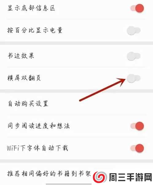 3、进入设置页面,可以看到有一个横屏双翻页点击打开即可横屏。