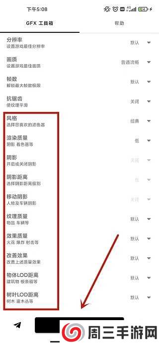 先在gfx工具箱最新版本设置好如上面参数时,工具箱应用设定后进入游戏,在游戏设置里手动把工具箱没有改好的设定修改一下,如画质高清改为最流畅。