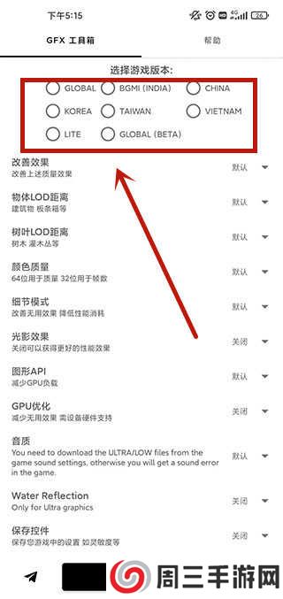 1、想要使用用gfx工具箱官方正版来提高pubg、和平精英画质的话,大家需要先在主页的顶端点击选择不同的版本,其中包括有国际服、国服、韩服和台服等八个版本,在选择后就能对画质进行自定义修改了。