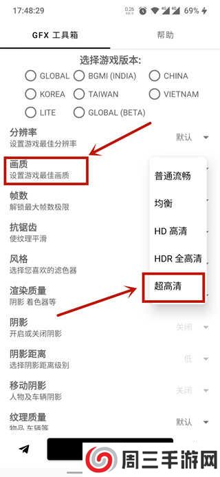 4、可看到包括普通流畅、均衡、HD高清、HDR全高清和超高清选项,越往下说明效果越好,用户可根据手机配置情况自行选择,