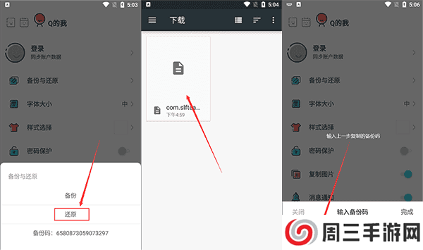 4、复制完成后,选择【还原】,然后找到你要还原的数据后,输入备份码,最后点击完成即可;