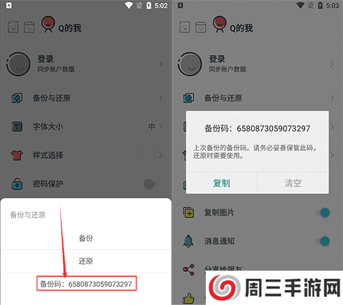 3、点击此选项后,选择【备份码】进行复制(后续还原需要用到);