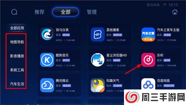 3、用户也可以打开全部应用页面,根据应用分类查找(地图导航、影音播放、系统工具、汽车生活等);