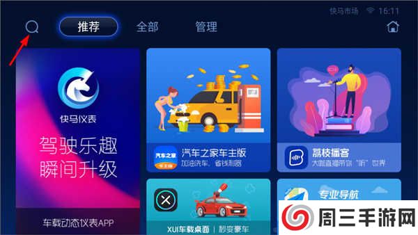 1、在车机中打开快马市场车机版软件,进入主页,用户可查看市场内推荐的应用以及全部可下载/已下载应用,点击左上角搜索框;