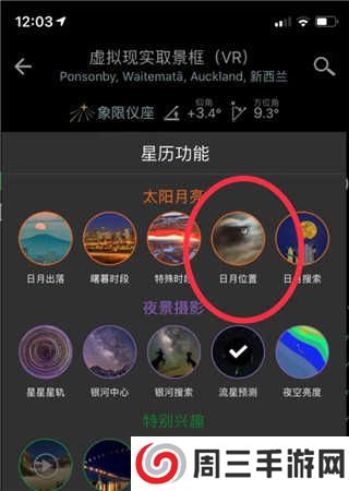 2、焦距上面一点点,有一条彩色方块可以调出你要拍摄的内容,这里选择“日月位置”。