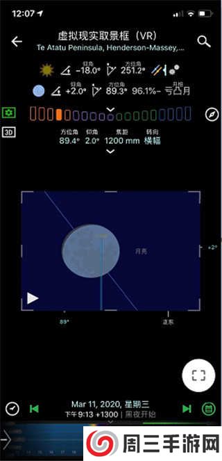 5、屏幕左下角的时间按钮,按一下就会变成现在时间。拖动滑块就可以看到月亮的移动轨迹,下面这张,是如果使用1200mm(600mm加2倍增距镜),在12公里以外的效果。