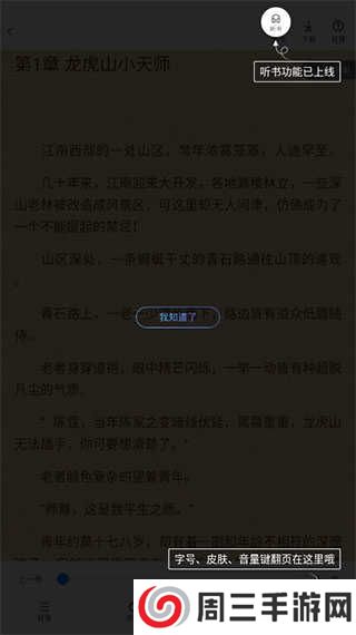 3、进入阅读界面,点击屏幕中心,它会弹出各种功能,点击听;