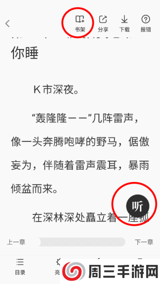 4、点击上方的书架可以将小说加入自己的书架,点击“听”可以开始听书