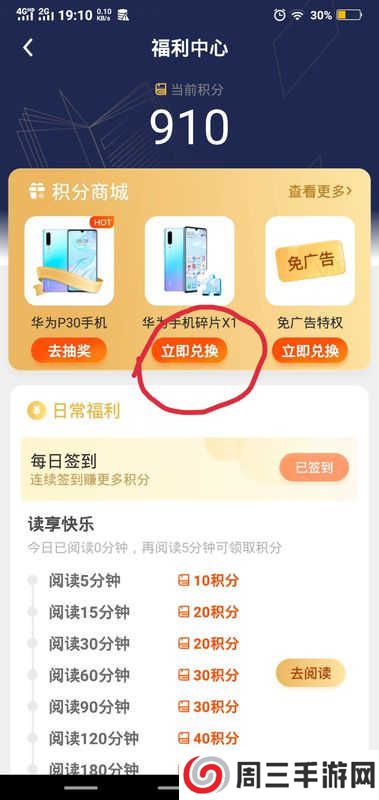 在疯读小说中,集齐10块碎片,就可以兑换华为P30手机。想要获得碎片,有两个途径:抽奖和兑换。抽奖消耗30积分,兑换消耗50积分。