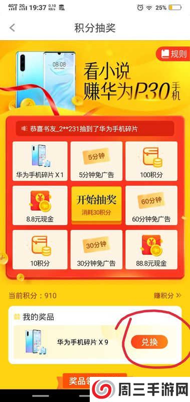 6.集齐10个华为手机碎片即可在积分抽奖页面兑换华为手机,至此,疯读小说兑换手机操作步骤完成。