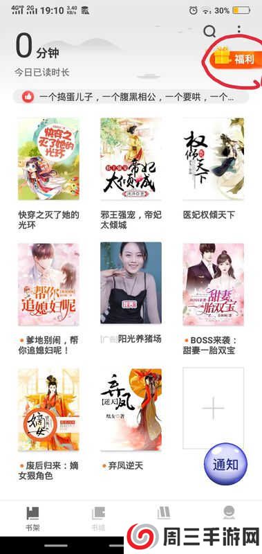 3.在书架页面点击右上角福利。