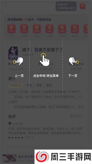 2.然后在小说的页面中我们可以看到有左边上一页、中间呼出菜单、右边下一页提示,我们点击页面中间;
