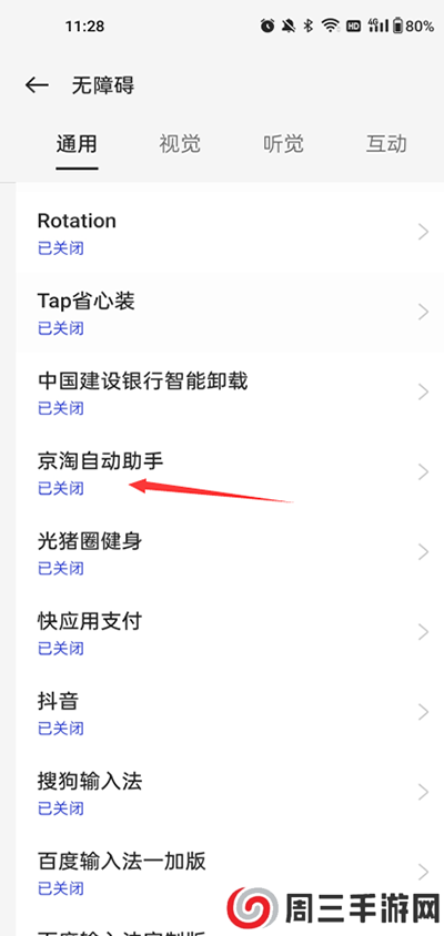 2、在无障碍服务功能栏里面找到《京淘自动助手》的无障碍开启。