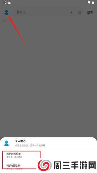 8、当然,软件支持登录,点左上角头像,弹出个人中心,选择同步歌单的类型。