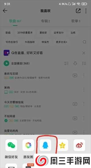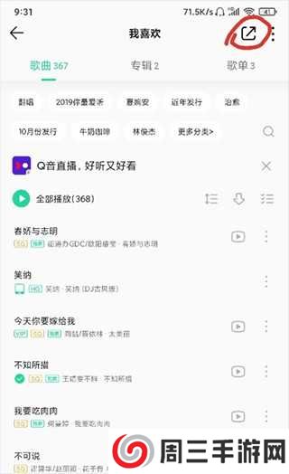 1、打开QQ音乐,打开我喜欢的列表,点击右上角分享;