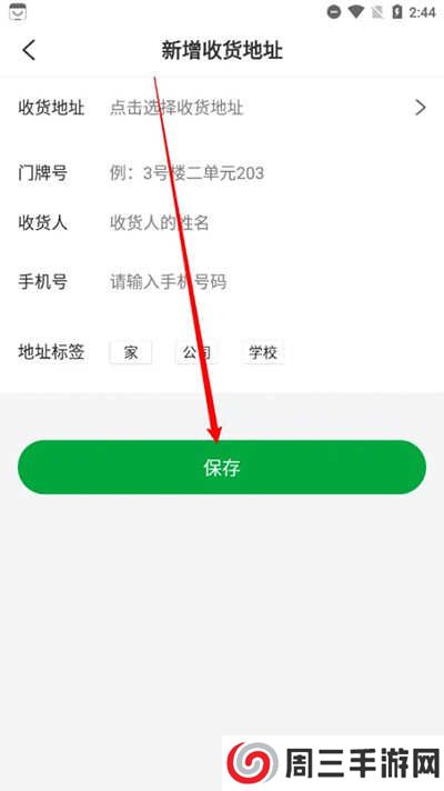 3、进入新增收货地址界面,输入收货地址、门牌号、收货人、手机号、地址标签,点击【保存】。