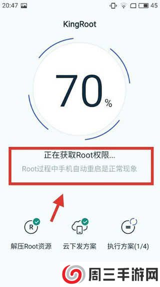 5、点击【一键root】,root过程正式开始,期间大约需用1分钟左右的时间,因部分机型差异,时间可能稍长。
