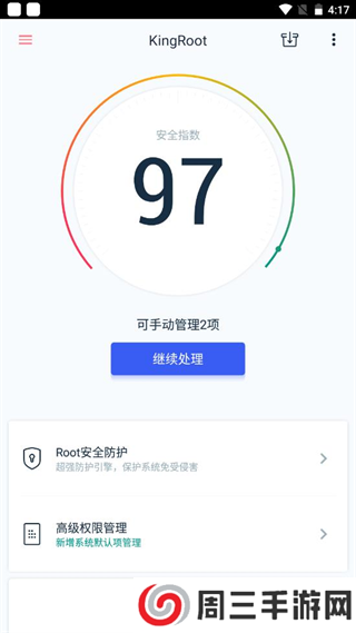 之后,King Root软件会为你的手机自动检测安全指数,并把不安全的因素逐个解除。其中有一些需要手动管理,只要点击立即处理便可处理。