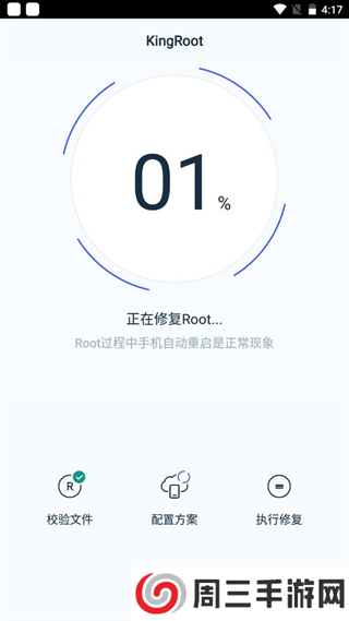 当我们点击进入软件时,King Root系统就会自动为你检测Root环境,并为手机获取Root权限。要注意,在获取权限过程中,手机如果出现重启的状况,属于正常现象哦!