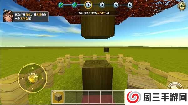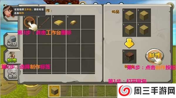 你当获得木头之后,即可点击【背包】→【制作】标签页合成工作台,工作台需要四块木板(任意树木皆可合成木板)