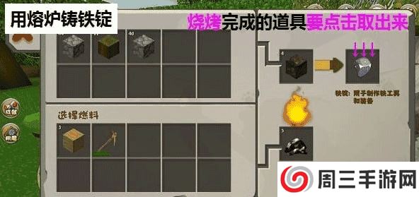 注:熔炉是通过制作台用石块合成的,熔炉不仅能烤食物,还能铸铁锭、将沙子烧成玻璃