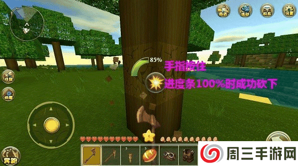 答:点击快捷栏上的斧子,拿在右手中,靠近一棵树干,手指按住树干上的方块,进度条出现,当进度条100%时树干被成功砍下。